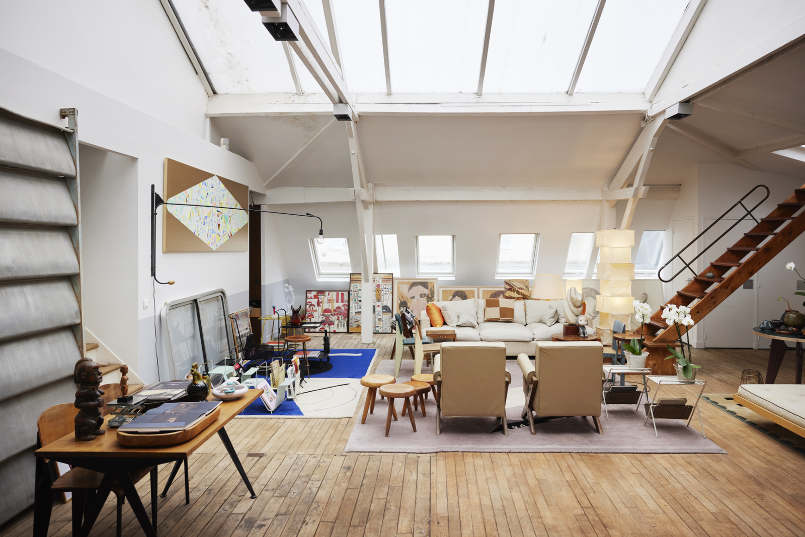 활기찬 에너지로 가득한 파리 11구에 사는 티에리 라모얀는 40여 년 전, 물도 전기도 없었던 텅 빈 공간에 벽을 세우고 방을 만들어 지금의 보금자리를 완성했다. 그리고 그곳에 자신을 매료시킨 장 프루베, 피에르 잔느레 Pierre Jeanneret, 르 코르뷔지에 Le Corbusie, 샤를로트 페리앙 Charlotte Perriand 등이 디자인한 가구를 채워 넣으며 수집 생활을 시작했다. 소문을 듣고 찾아온 주변 사람들의 요청으로 빈티지 가구를 하나 둘 구해다주던 정성은 ‘갤러리를 원’을 열게 된 계기. 프랑스 모던 디자이너들의 유산이 가득한 그의 집은 이제 갤러리이자 사무실, 쇼룸으로 자리한다. 매일같이 가족과 직원, 고객과 손님들이 드나들며 공과 사가 한 데 어우러지는 생활의 장단점을 묻자 티에리가 명쾌하게 대답했다. “장점만이 있고 단점은 하나도 없다”고.