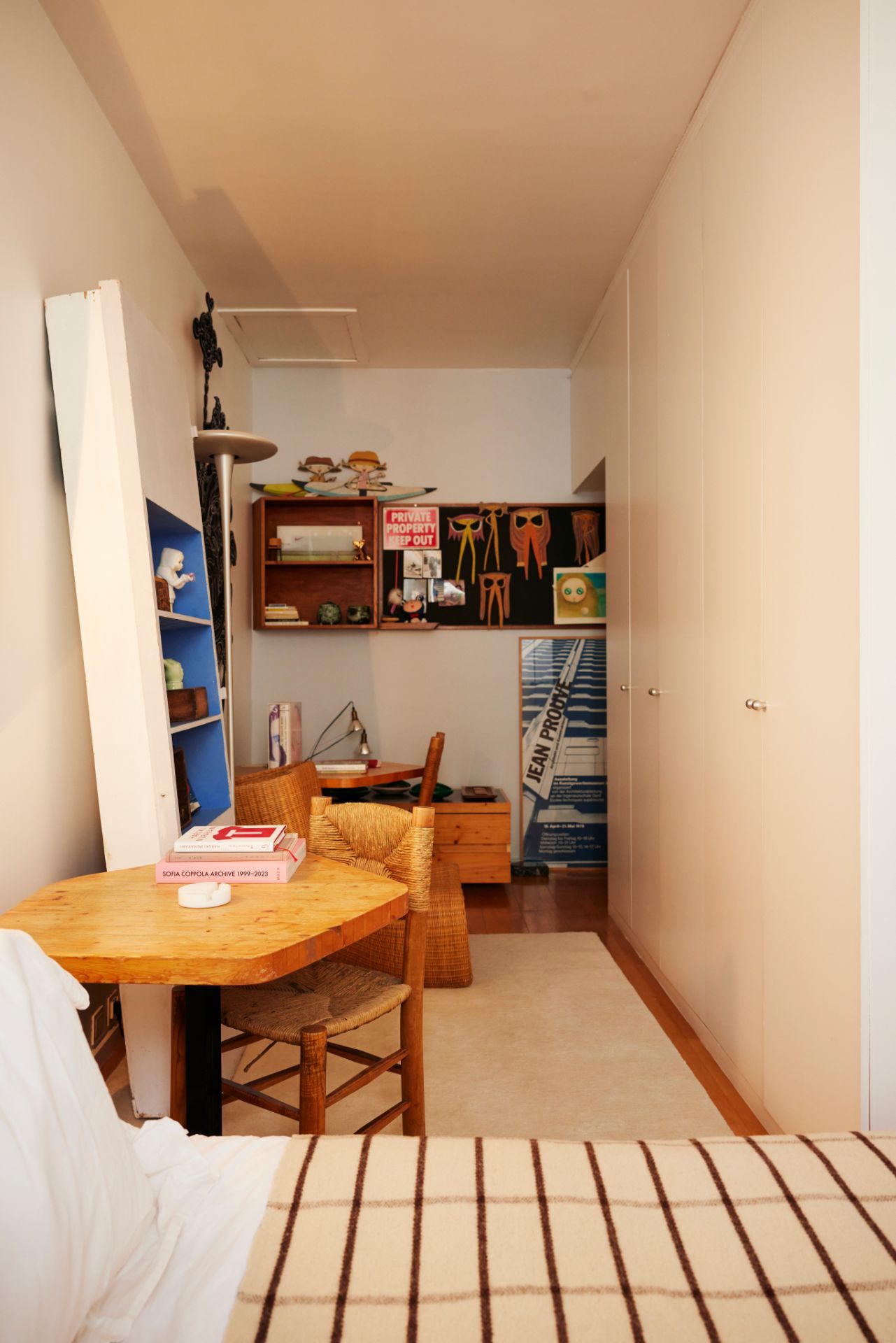 업무를 보는 공간이에요. 제가 가장 좋아하는 장 프루베의 메트로폴 306은 40년 전부터 메일 사용해온 ‘제 의자' 입니다. 40여 년 전, 파리의 컬렉터 디디에 티소Didier Teisso로부터 구매했어요. 그는 여전히 열정적으로 전후 디자인을 다루고 특히 르 코르뷔지에를 심도 깊게 연구하는 분 입니다. 당시 저는 마래에 위치한 그의 작은 갤러리에서 인조가죽을 사용한 이 푸른색 스탠다드 체어를 처음 발견했고, 즉시 사랑에 빠져서 3분 만에 구입하기로 결정했어요. 순식간에 돈을 지불하고 의자를 자동차 트렁크에 넣어 집으로 돌아오던 그 날이 생생하게 기억나요.